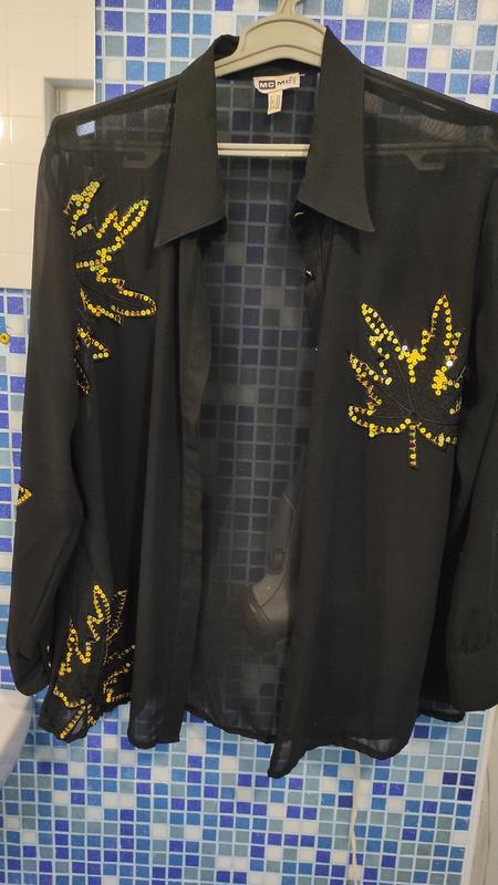 прозрачная блуза с красивыми кленовыми листьями. отлично смотрится с черной маечкой на брителях.мне стала велика.замеры по запросу.