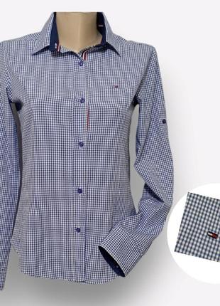 Сорочка від Tommy Hilfiger. Крій приталений, логотип бренда на грудях, ґудзики брендовані. Є запасні ґудзики. Комір із вивороту та планочка підбиті контрастною тканиною — червоною. Розмір вказаний S. 🌼 плечі 37 🌼 ПОГ 45 🌼 ПОТ 41 🌼 НОС 44 🌼 довжина рукава 60 🌼 довжина 63 Стан нового.