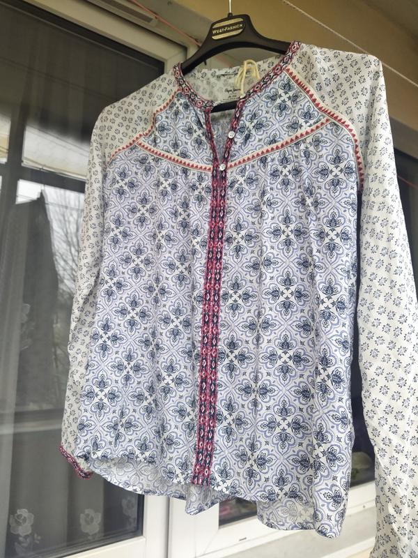 Рубашка с элементами вышивки от известного бренда Pepe jeans. Полностью натуральный состав 100 процентов модал. Идеальное состояние - новая вещь, не одевалась, осталась завязка от магазинной бирки. Гудзики брендированные, выполнены под винтаж. Много брендированных элементов: вышивка сзади на плече, металлическая бирочка спереди. Сзади чуточку длиннее. По бирке размер 16, но чуточку маломерит, и ткань не тянется, поэтому ориентироваться следует на замеры. Длина по спине 61 см, полуобхват 52 см, рукав не имеет плечевого шва и общая длина 68 см, от подпахов 48 см.