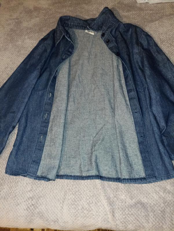Женская джинсовая рубашка синего цвета, с короткими рукавами.