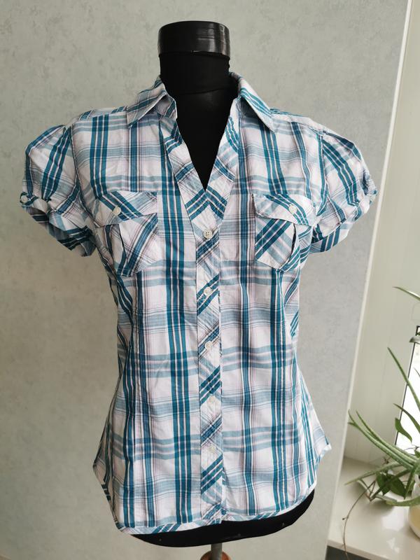 З короткими рукавами. Застежка - пуговицы. С двумя накладными карманами на груди. На размер м. Плечи 40-41 см. ПОГ 47-50 см. ПОТ 41 см. Длина 60 см.