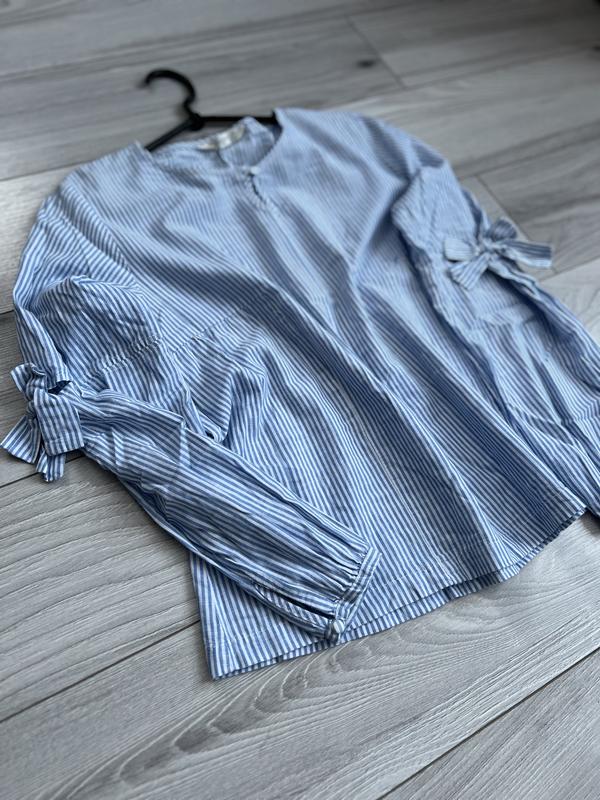 Рубашка фирмы Mango в красивый принт🩵 Красивые бантики на рукавчике, внизу защипывается на пуговицах и у шеи также. Стан - идеальный (без дефектов) Размер S-M Цена 250