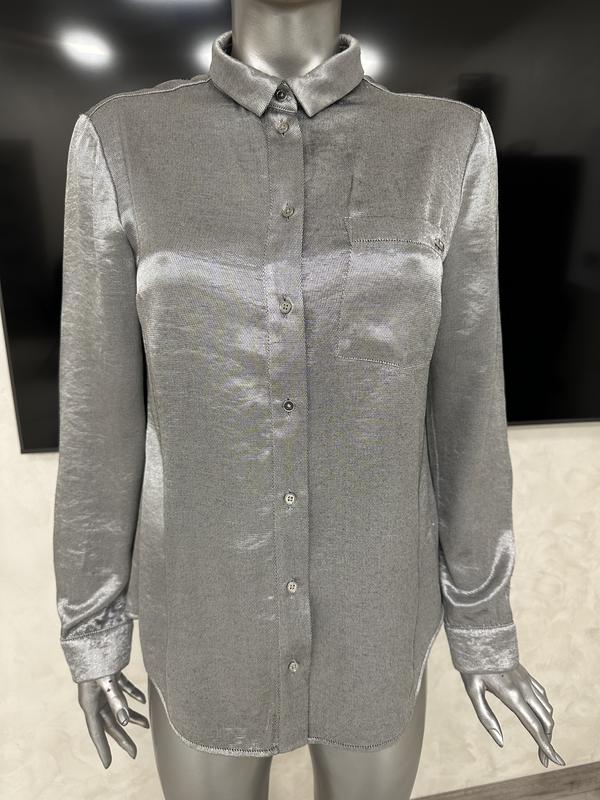 Красивая серебристая рубашка в отличном состоянии! Размер 38. Замеры: длина 69см, пог 50см, рукав от шва 60см, плечи 40см.