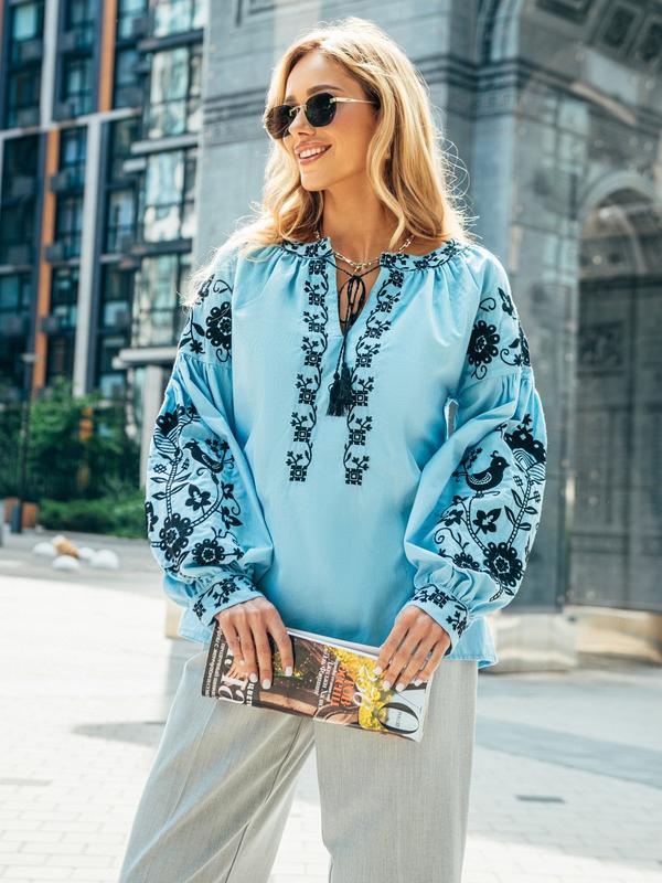💙Вышиванка из высококачественного материала свободного кроя со спущенной линией плечевого шва. Горловина дополнена завязками с кисточками. ✔Размер: 44-46, 46-48, 48-50 ▪️длина изделия - 60см ▪️длина рукава -65 см. 🧵Состав: 80% коттон, 20% полиэстер 🎨Цвет: белый,черный, голубой 🧵Материал: Коттон 💳Цена:1350грн Арт90433 ‼️Количество ограничено!!!️