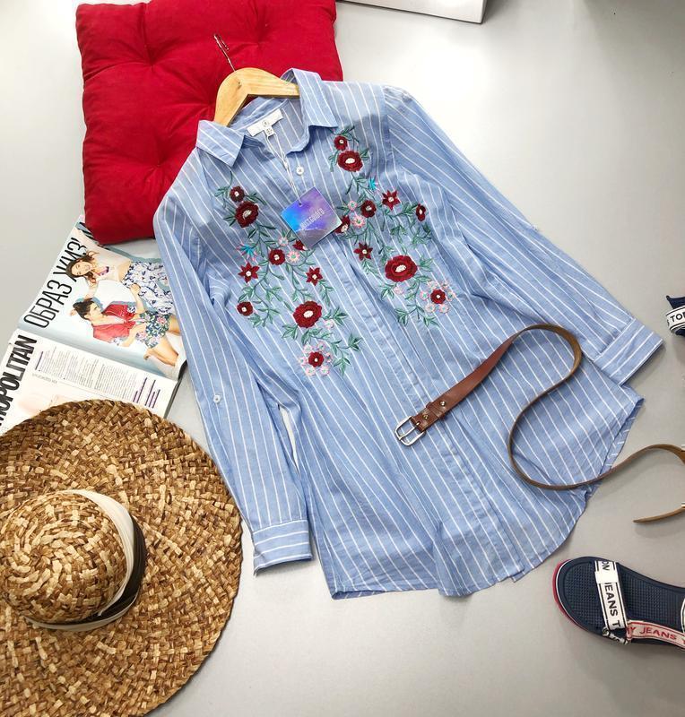 Якісна сукня сорочка із натуральної тканини з гарною вишивкою. Легка, вільна, приємна до тіла. Можна носити і як подовжену сорочку або заправити всередину. Ніжний небесно-блакитний колір в тонку актуальну вертикальну білу смужку. Виміри: пог 56, пот 53, поб 60, довжина 82. рукав від плеча 62 Склад: 100% cotton