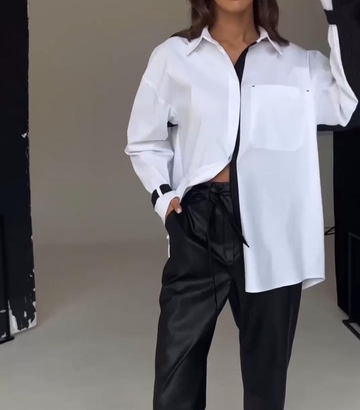 Сорочка застібається на ґудзики, має вільний крой , Рукава можливо зав’язати. Кольори: білий + вставки чорний колір, змужка біла. Розміри: 42-46, 48- 52. Тканина: турецький щільний софт + тіар смужка.