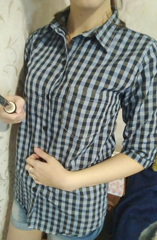 Рубашка в черно-синюю клетку. Рукав 3/4, можно подкатить рукав (фото 2 левый рукав) Замеры: ПОГ - 43 см, Длина рукава - 35 см, Ширина плеч - 34 см, Длина - 62 см. Смотрите все мои объявления, есть много интересного. При покупке нескольких вещей - скидка.