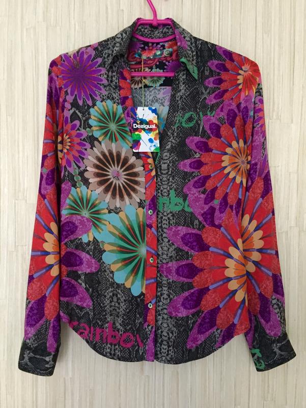 Рубашка известного бренда Desigual (Испания). Новое состояние. Размер XS. Длина по спинке - 65 см, ПОГ - 42,5 см, ПОТ - 40,5 см, длина плеча - 11-11,5 см, длина рукава - 63-64 см. Очень приятная по составу ткань. Смотрится супер классно!