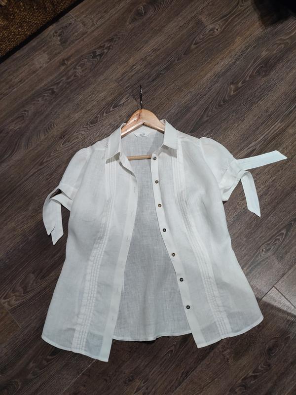 Блузка Marks Spencer, белочка, как на первых фото, 100% лен, размер указан 8, ориентироваться на замеры: плечи 34 см, расстояние от подмышки до подмышки 47 см, рукав 16 см, длина по спине 59 см. Стан великолепен. Фото на теле не имеет. Делайте выбор сознательно, возврат не имеет