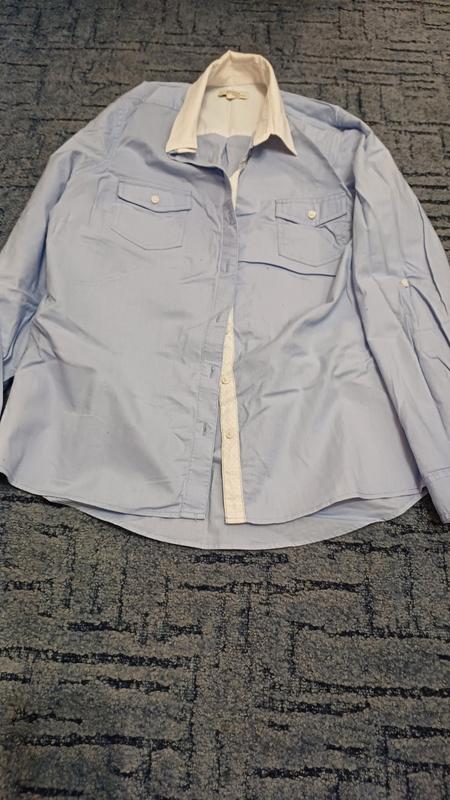 рубашка на длинный рукав. на гудзиках цвет - голубой воротник - белый размер 14