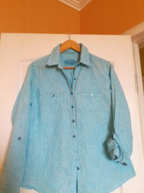 Цвет красивый насыщенный бирюзовый.Принт вертикальные белые полоски.Состав 100%лен.Мягкий легкий и дышащий. Качество льна и пошива отличное.Два накладных карманчика на пуговицах.Рукав трансформер.Размер 10.Замеры ПОГм. Длина 65см. Длина рукава 63см. Ширина плеч 38см.Стан очень хорош.