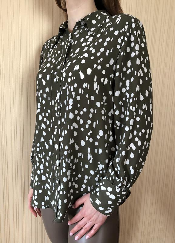Оливково - біла сорочка Marks&Spencer у розмірі 12 (L). 100% поліестер Довжина 75 см Рукав 60 см Спина 40 см Напівобхват грудей 53 см