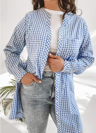 Женсеая рубашка из поплина в клетку с застежкой на пуговицы. Размер: 46,48,50. Рукав длинный на манжете. По длине регулируется с помощью хлястика и пуговицы. По бокам разрезы.