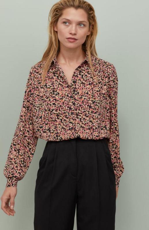 Рубашка в цветочный принт с полуобъемными рукавами.Ткань приятная,прохладная на ощупь.Тонок,не просвечивается.Скорее всего вида шифона.Пог-61.Пот-61.Поб-62.Ширина спинки-38.Довжина блузки-62 спереди, сзади-66.Довжина рукава от горловины-72.Рукав застегивается на пуговицу, но объем круга запястья руки-16 см.