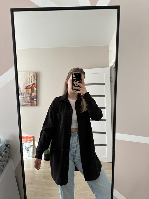 Черная шифоновая рубашка, чуточку удлиненная, имеет вырезы по бокам, легкая на лето супер. Укр бренд, назву не памʼятаю