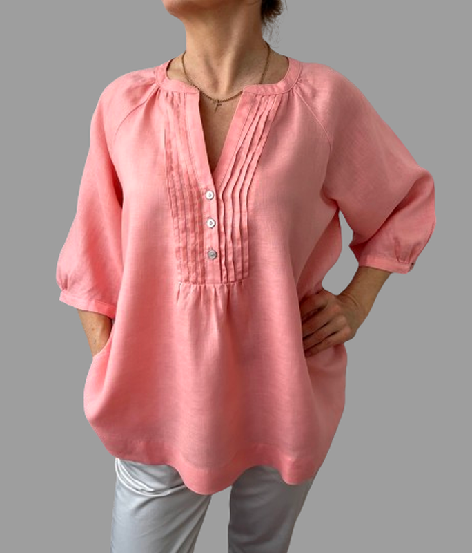 Женская розовая льняная рубашка со стойкой Monsoon/Англия , новая Размер L, на 48-52. Ширина в груди 63, бедра 65, длина 70, длина рукава от горловины 49 Состав: 100% лен