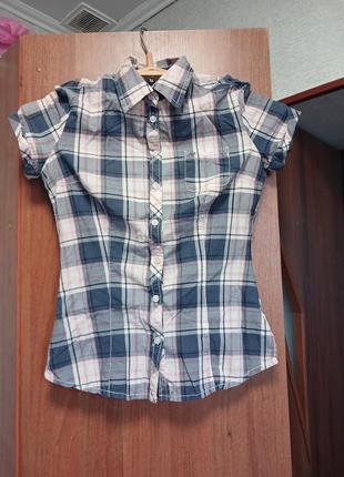 Хлопковая тенниска зауженная по фигуре с разрезами по бокам, в очень хорошем состоянии. Плечи 40см, высота 62см, рукав 17см,обхват груди 90см, обхват талии 76см. Цена 50грн