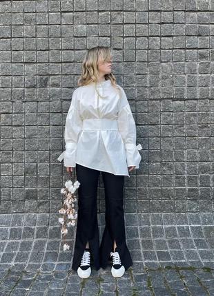 Хлопкова біла сорочка з незвичайним розрізом на плечі, стійкою та рукавами з зав'язками. Для тих, хто цінує гармонію форм та контура, до нашої сорочки в комплекті є пояс, який створить ідеальний акцент на вашій талії. Склад: бавовна 100% Розмір: one size (s-m) Додаткові характеристики: Колір: Білий Матеріал: Бавовна Фасон рукава: Довгий Товар виготовляється на замовлення