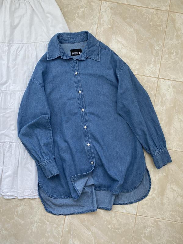 Удлиненная джинсовая рубашка Pieces Красивые жемчужные пуговки Размер М, фасон оверсайз Замеры: Плечи шов приспущен ПОГ 60 ПОТ 61 Длина спереди 75 , сзади 83 Рукав от горловины 73