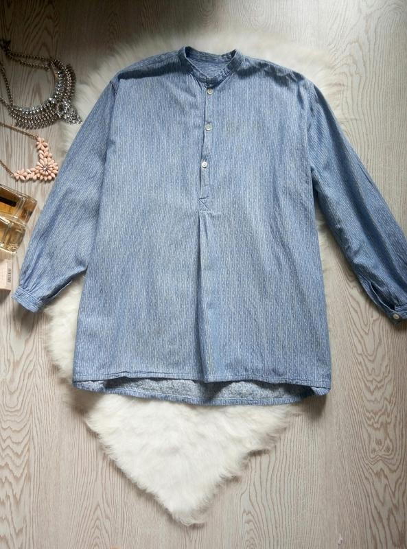 Голубая плотная рубашка с длинным рукавом туника без воротника вышиванка под джинс батал