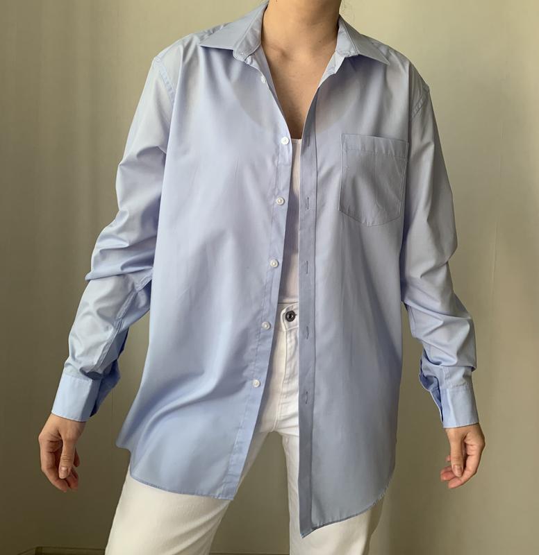 Сорочка блакитного кольору Розмір Л У складі 35% катон, 65% поліестер Довжина 80 см, довжина рукава 65 см, напівобхват грудей 58 см Стан ідеальний Вдягнуто на розмір Л, зріст 167
