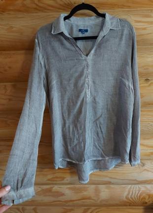 Котон серый, но с неоднотонной покраской, есть места как бы стильной "потертости", рукав можно подкачать и фиксировать пуговицей. Классная вещь на лето. Свободная. Плечи 48 см Рукав 63 см Груди 50 длина спереди 67 Длина сзади 79