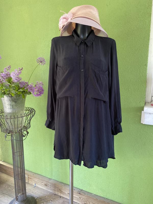Черная удлиненная рубашка от ZARA. Размер по набору-L.. Бирка с составом срезанная, на ощупь-вискоза.Замеры: длина по спинке-90 см, по переду-84 см, ПОГ-51 см, ПОБ-51 см, рукав-60 см.