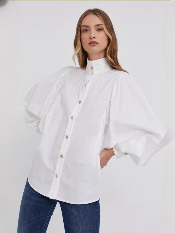 Стильная рубашка свободного кроя . Рукав обьемный Размер 10 Ширина 58 ,см Длина 85 см Плечи 48 см Рукав 73 см от горловины Бирочка с составом срезана. На ощупь- коттон, возможно с примесью