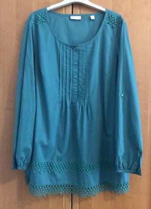 Натуральная, приятная, украшенная кружком. Рукав можно с подворотом. Длина 75, объем 60, рукав 62.