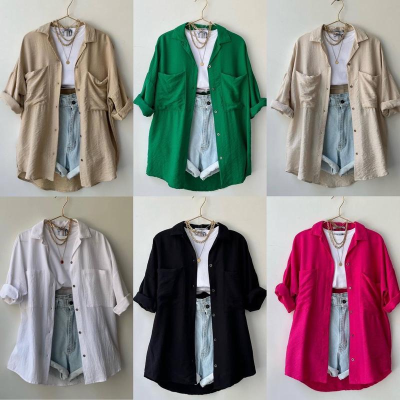Базовые рубашки на лето ЦИНА -4️⃣5️⃣0️<unk> грн 🛍️ Цвета: св. беж, темный беж, зеленый, малина, белый, черный ➡️Мод: 4125 ➡️Размер: 42-46 (oversize) ➡️Ткань: американский креп (жатка) 💙 Длина 65см длина рукава 65см, ОГ до 106см