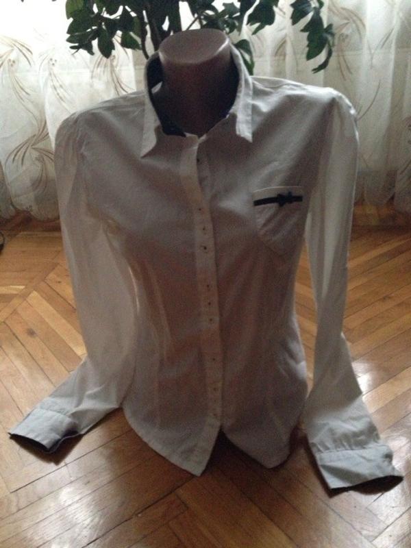 Рубашка смотрится супер.Коттон со стрейчем. Размер указан М. Длина рукава по внутреннему шву 47,5см, ширина в груди 48см. Длина от плеча 58,5см. На внутренней стороне воротничка и манжетах темно-синии вставки, дополнена бантиком в тон на кармашке.