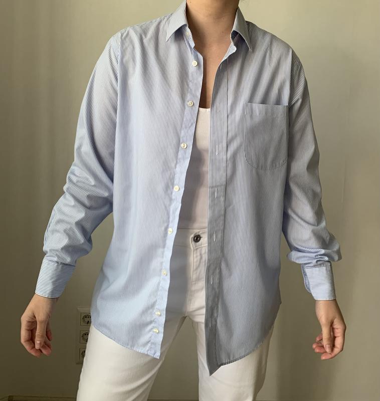 Сорочка у смужку, блакитного кольору від бренду Marks&Spenser Розмір М У складі 35% катон, 65% поліестер Довжина 80 см, довжина рукава 64 см, напівобхват грудей 55 см Стан ідеал Вдягнуто на розмір Л, зріст 167