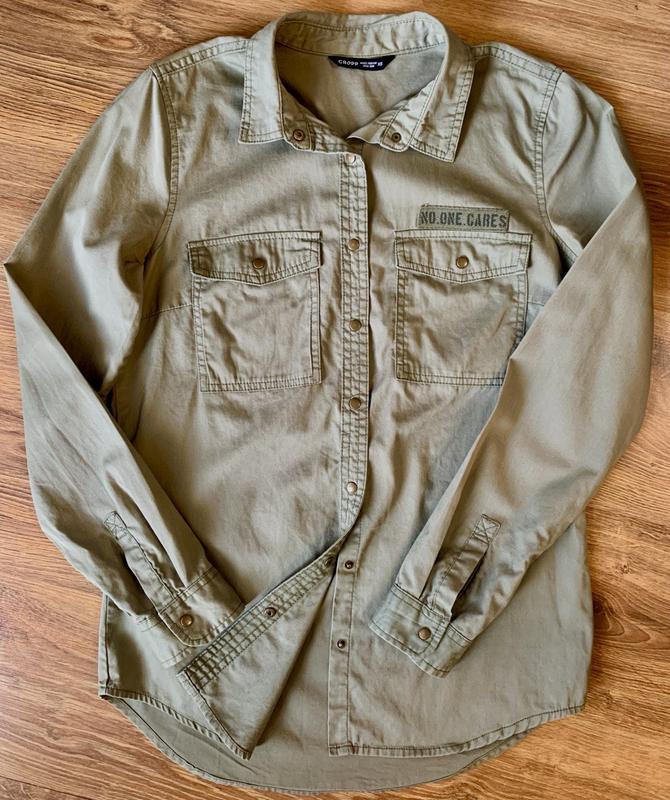 Рубашка прямого кроя, цвета хаки, в стиле милитари, застегивается на кнопки размер: XS длина по спинке: 70 см полуобхват: 46 см плечи: 36 см рукав от плеча: 60 см Без дефектов, в хорошем состоянии