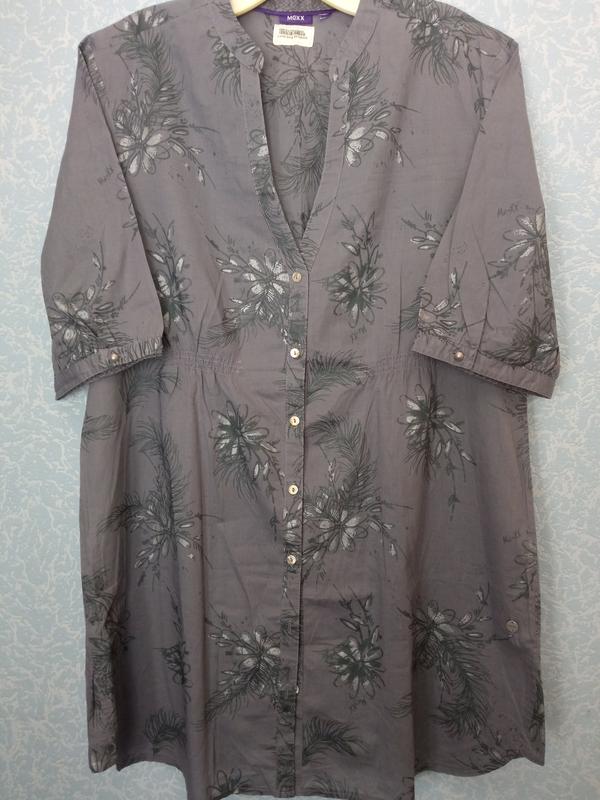 Очень комфортная удлиненная рубашка, приятная к телу ткань, чистый хлопок, цвет серый с серебристыми цветами, под грудью и сзади на спине небольшие резинки, для формирования силуэта. Плечи 42 Рукав 33 ПОГ 57 ПОБ 62 Низ 66 Длина 85