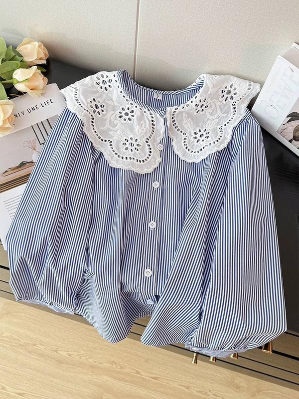 Женская рубашка в попурярном принте в полоску, с добавлением акцентного ажурного воротничка✨ Мод: 2400 Размер: универсал м/л (по бирке л) Тканина: бавовна Цена 500 грн