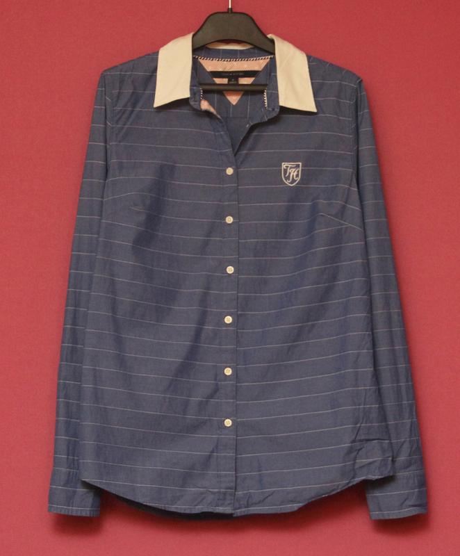 Рубашка из хлопка и 1% спандекса от Tommy Hilfiger. Белоснежный накрахмаленный воротник. Горловина изнутри опоясана плетёным шнуром. Треугольник между лопаток исполнен розовым хлопком в вензель бренда, такой же хлопок на внутренней части пуговичной стойки. Минеральные пуговки, выточка под грудь. Плечи - 40 Подмышки - 50 Длинна - 68 Рукав по-верху и по-низу - 65, 50