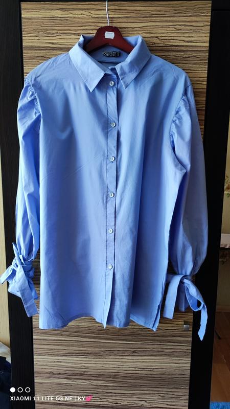 Рубашка очень красивого голубого цвета, в красивом состоянии, размер 52-54, на пуговицах. На рукавах ленты, которые можно завязать. Стильно смотрится. Можно как под брюки так и с юбочкой. ОГ и ОБ - 58 см. Длина 70 см.