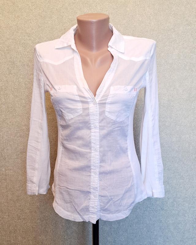 Легкая тоненькая из натуральной ткани рубашка блуза со вставками и регулятором длины рукава в идеальном состоянии замеры все находятся на фото
