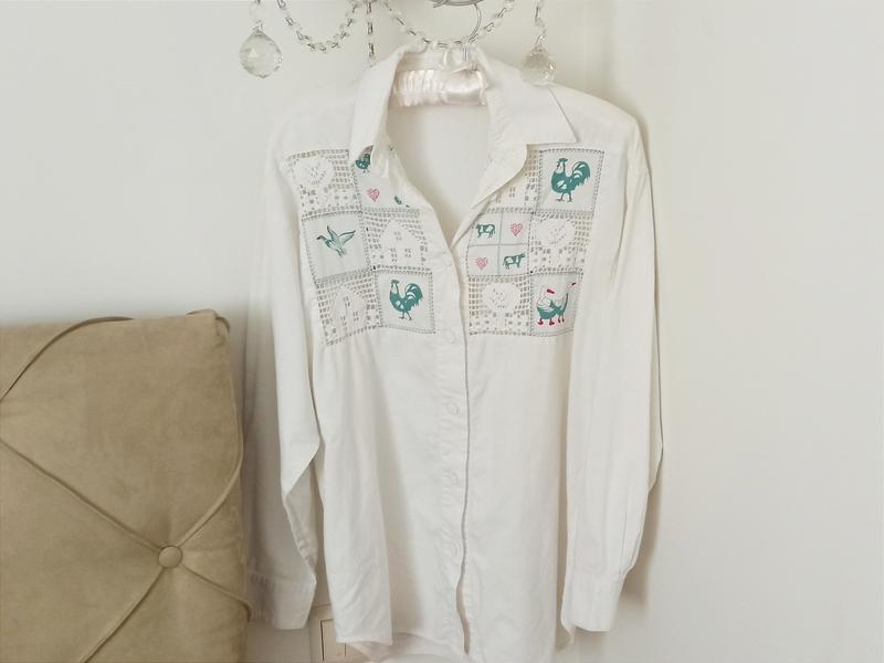 Качественная рубашка с сельским рисунком, украшена узорным плетением. Чрезвычайная вещь.