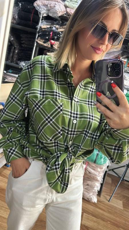 🔥Новинка oversize🔥 Хит и лидер продаж. Вы так давно задаете вопросы, когда будут любимые рубашки. Так от 💁♀ 💙💛В наличии💙💛 Фото реал Арт. 3-318 Размеры 1 (42-48), 2 (48-54) Рубашка из турецкой фланели в клетку (100% хлопок, качество лучшее, которое только может быть) классического кроя. Линия плеча удлинена, а рукава заканчиваются широкими манжетами. Застегивается на пуговицы, горловина стойка с воротником, на спинке кокетка. На груди один большой накладной карман. Можно носить за классикой, можно соединить с платьем или юбкой, а можно как элемент образа связать на талии или накинуть на плечи. Цвет зеленый, оранжевый, розовый, серый, бежевый, голубой.