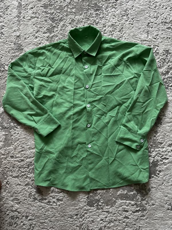 Рубашка в красивом оттенке зеленого цвета. Будет хороша на размер ХС-С. Хорошо смотрится если одевать поверх топа и носить расстегнутой. Имеет чуточку катышек, но машинкой можно убрать.