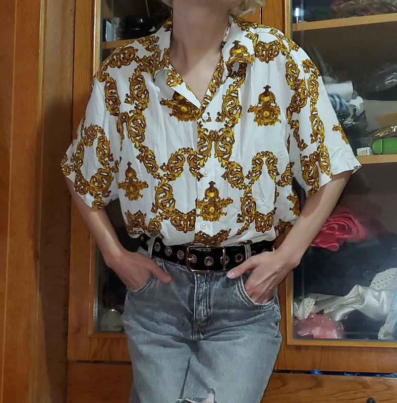 Рубашка Rebel в стиле versace р. М, отлично подойдёт как оверсайз на ХС-С, а также М. На фото рост 160см 83-64-83. Рубашка мужская, так как застёжка слева на право. Но она унисекс. Качество классное. Ткань вискоза, тоненькая и приятная к телу. Замеры по запросу. Возврат не предусмотрен. Цена без торга, плачу Шафе 14.6 %.