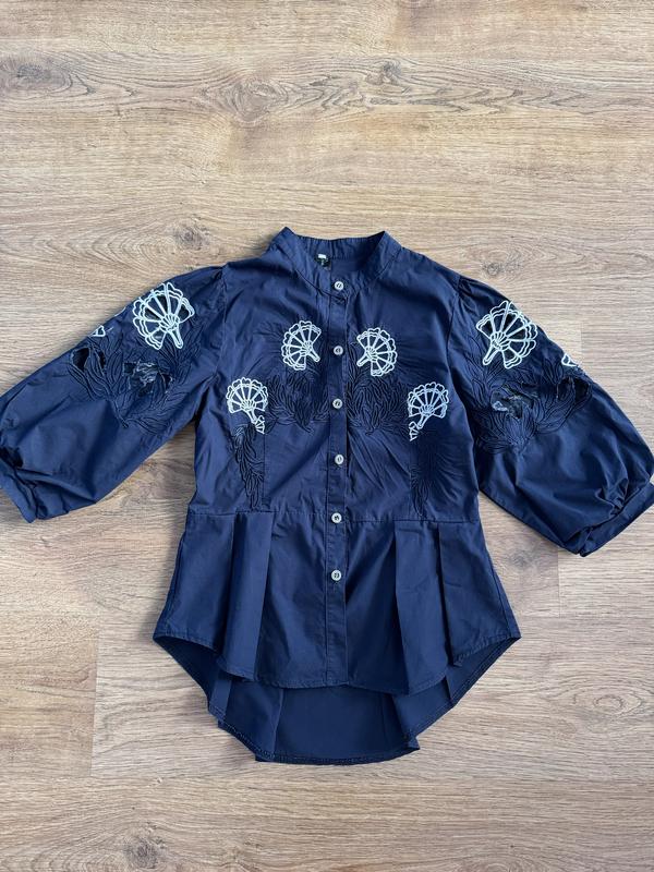 Рубашка синего цвета с вышивкой, спереди укороченная сзади удлиненная, размер подойдет на м-л