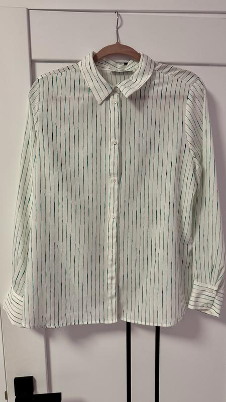 Очень красивая, стильная рубашка. Все в идеальном состоянии, но есть пятно под рукавом (последняя фотография). Упитанию пятно не очень заметно за счет дизайна рубашк (полосочек)