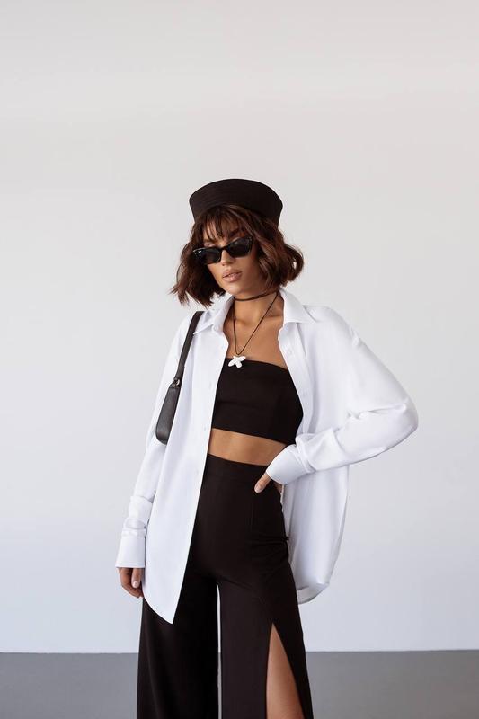 Сорочка бойфренд Код 424 Розмір: хс-с, м-л Тканина: штапель Колір: молоко Штани з розрізом на нозі Код 394 Тканина:креп-діагональ Колір: чорний, червоний, молоко, трава, небо Розмір: хс, с, м, л
