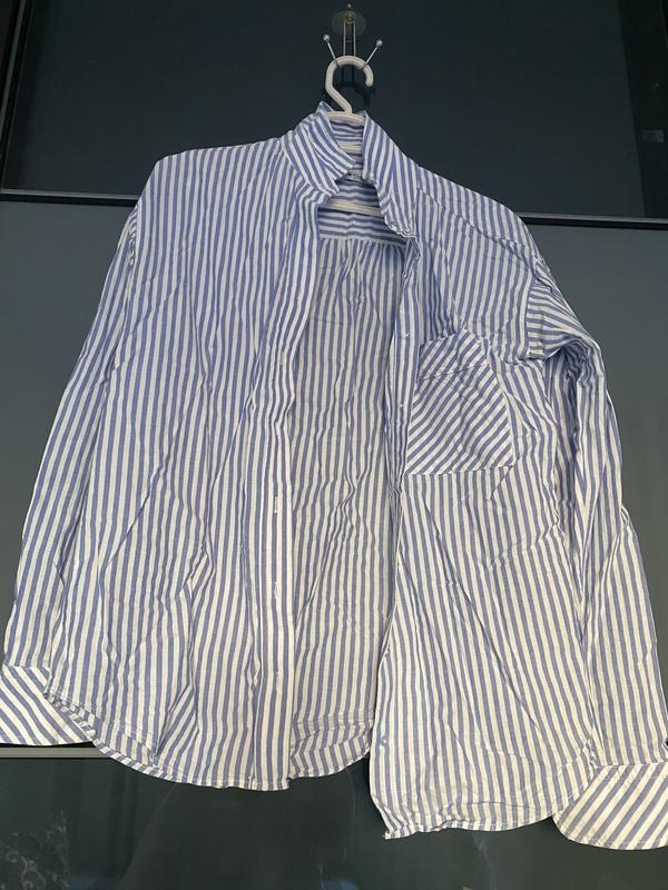 Рубашка в фиолетовую полоску фирмы Colin's, размер M, но не супер оверсайз. В хорошем состоянии