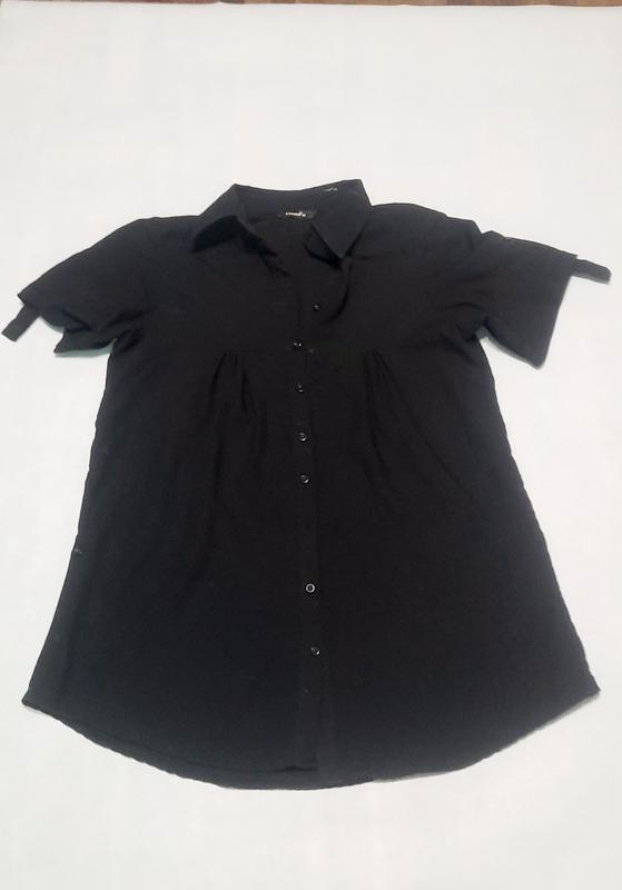 Черная лёгкая рубашка с коротким рукавом. Рукава подбирается на пуговички. Низ сзади закреплён. Состояние отличное. Замеры ОГ 106см длина рукава 20см длина по спинке 78см.