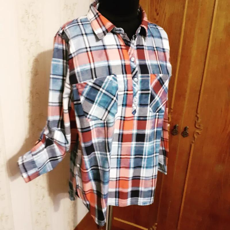 По составу катон бавовна мягкая приятная к телу с двумя нагрудными карманами на пуговках с боковыми разрезами с принтом разноцветной клетки👌Дл.73 Пл.42 Р 62/45на подхвате Б по 19 Ог 110 Об 118+б/р в 17см!