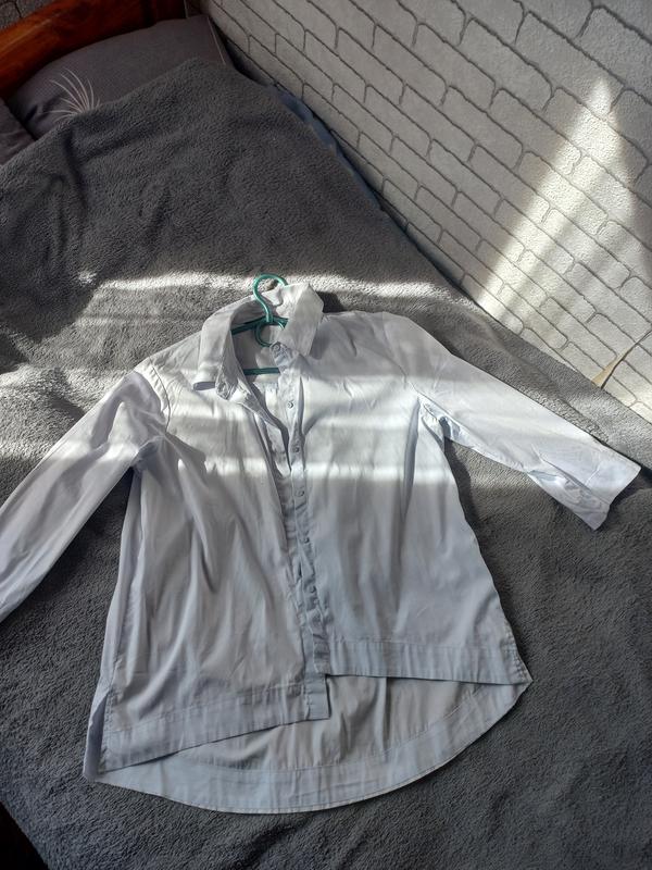 Рубашка укороченна. Цвет нежно голубой. Спереди укороченная, взади немножко длиннее. Стан идеален. Подойдет на xs и s