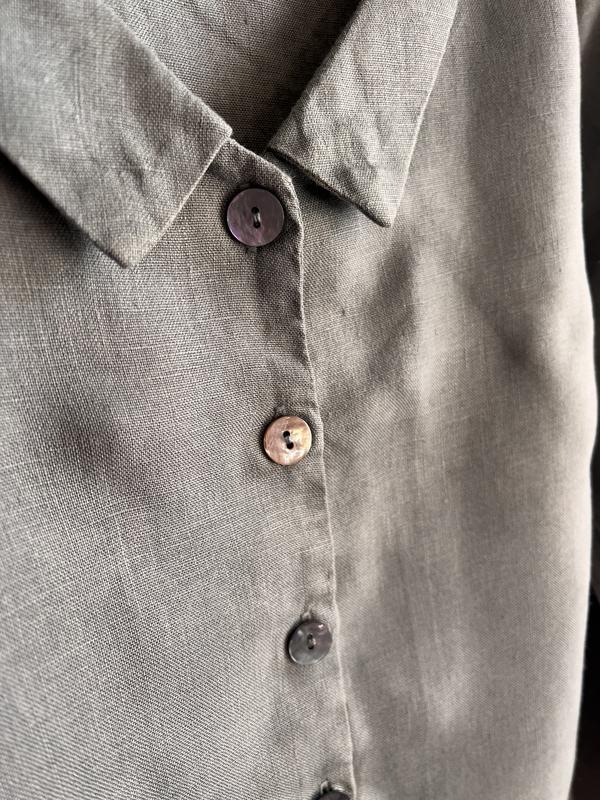 Льняная блуза укорочена с очень красивыми перламутровыми пуговицами.